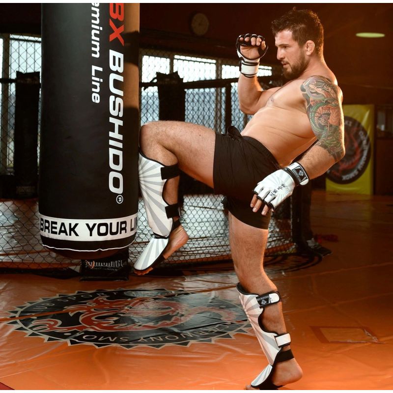 Trwała syntetyczna skóra wzmacnia każdy blok, a otwarta konstrukcja pozwala błyskawicznie przejść z parteru do stójki. Minimalistyczny biało-czarny design z sentencją „True victory is victory over oneself” przypomina, że prawdziwy rywal kryje się w lustrze.