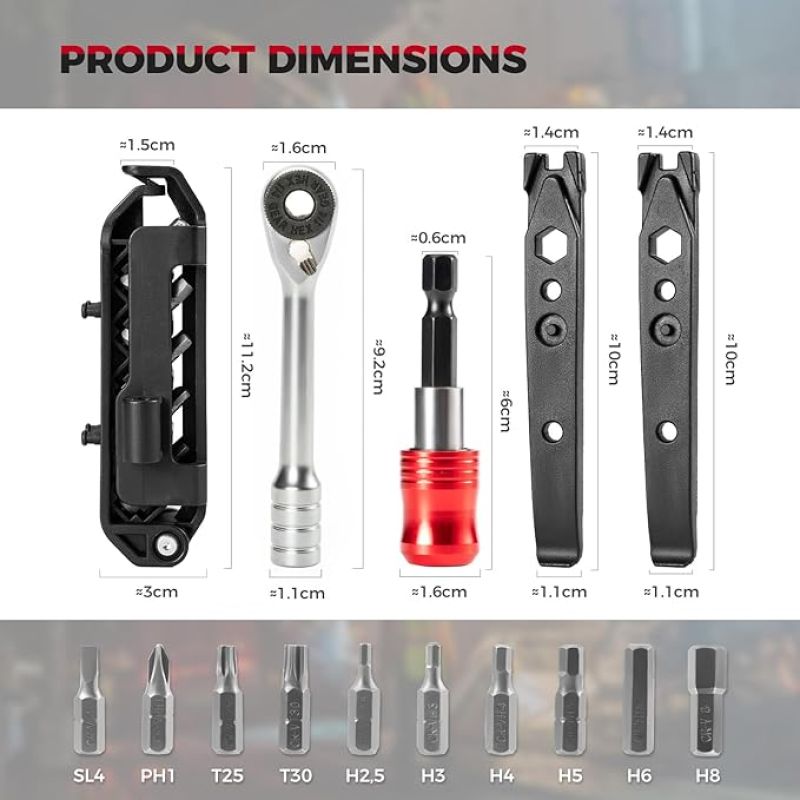 (imbus), T25/T30 (Torx), PH1 (krzyżak) oraz SL4 (płaski) – do regulacji kierownicy, siodełka, hamulców czy przerzutek; w zestawie 2 nylonowe łyżki do opon umożliwiające szybką wymianę dętki