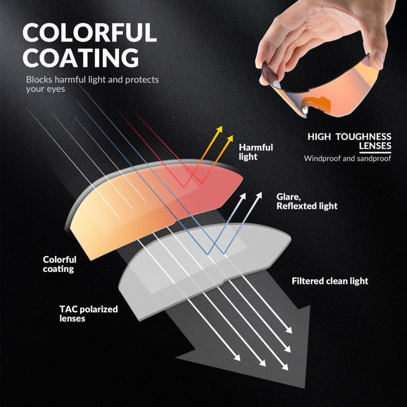 Polaryzowane soczewki HD TAC z wielowarstwową powłoką kategorii 3 oferują redukcję odbić światła od powierzchni takich jak woda czy asfalt. Chronią oczy przed szkodliwym promieniowaniem UV, minimalizując zmęczenie wzroku i poprawiając widoczność.