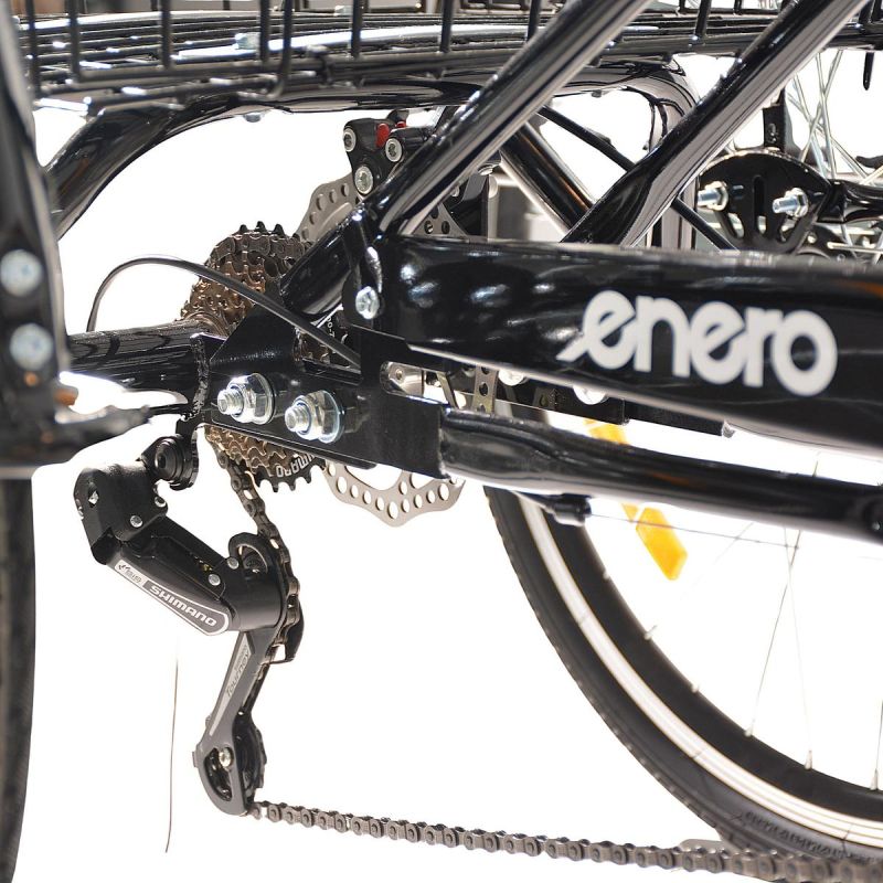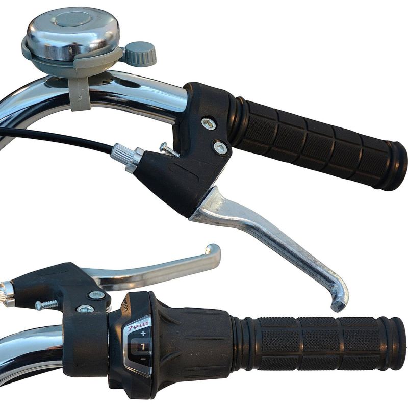 Sprawdzony osprzęt marki Shimano gwarantuje płynne zmiany przełożeń. 7 biegów ułatwia jazdę po różnego typu nawierzchniach, także przy większym obciążeniu kosza, pomaga też w dostosowaniu poziomu wysiłku do rodzaju trasy.