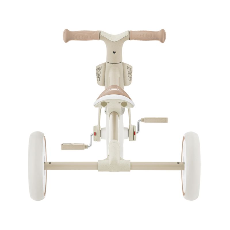 Model ma 100% beznarzędziową konstrukcję, siodełko z regulacją 2-stopniową, zdejmowane elementy (koszyczek i pedały), trwałą ramę, ergonomiczne chwyty TPR i lekkie koła EVA. Wykonany z GRS i dodatku włókien roślinnych*.