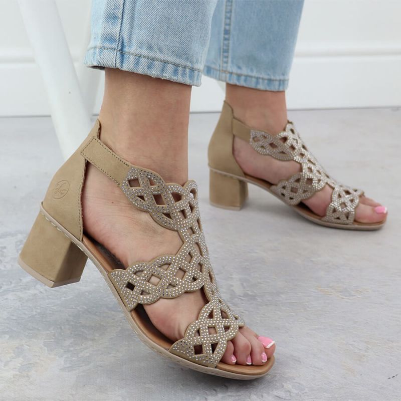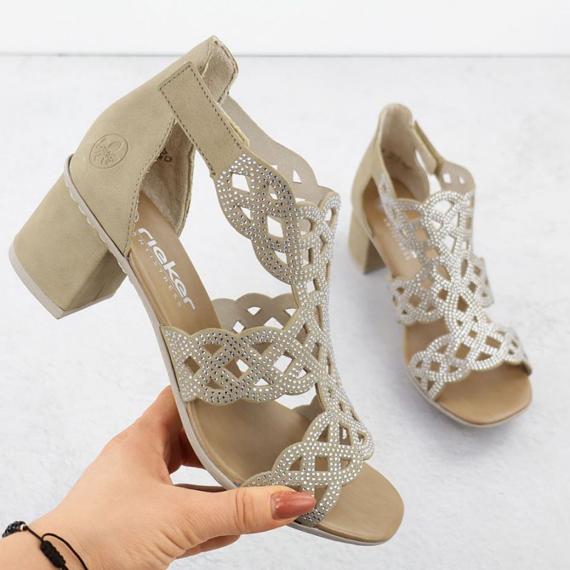 Sandały damskie na obcasie w cyrkonie beżowe Rieker 64773-61