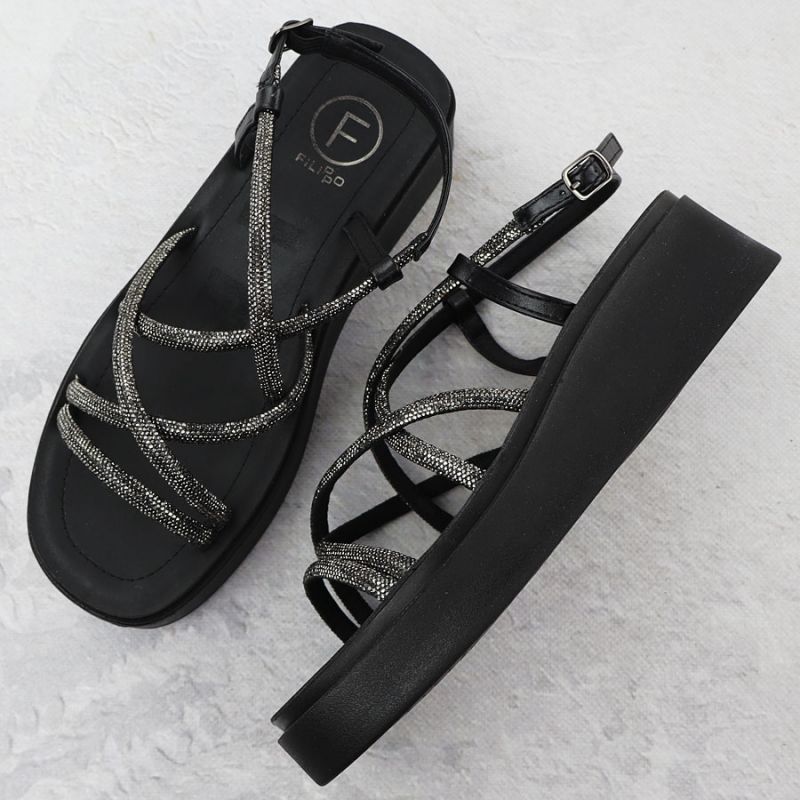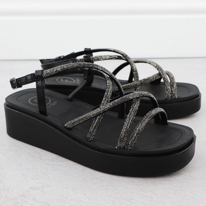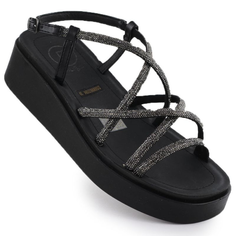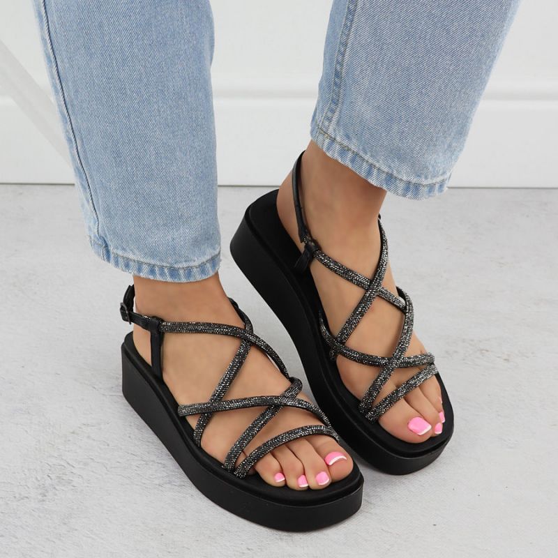 Sandały damskie rzymianki na koturnie z cyrkoniami czarne Filippo DS6898