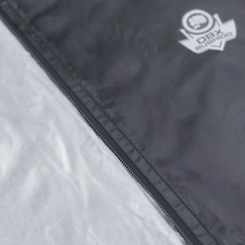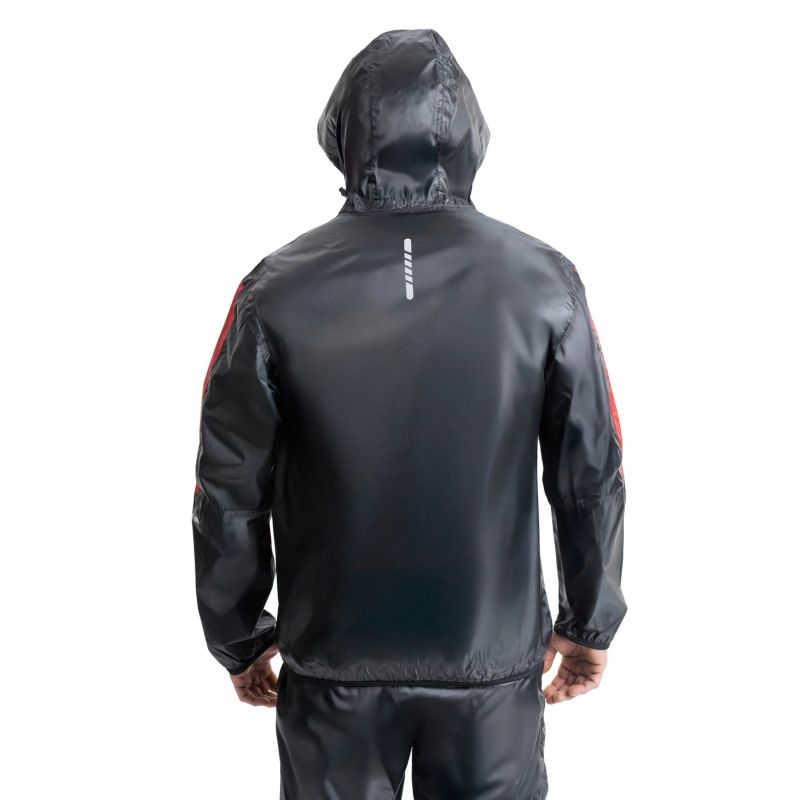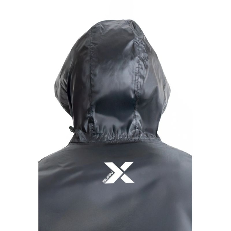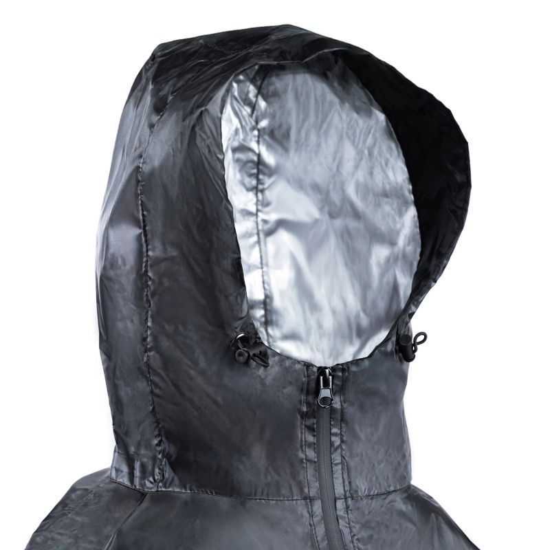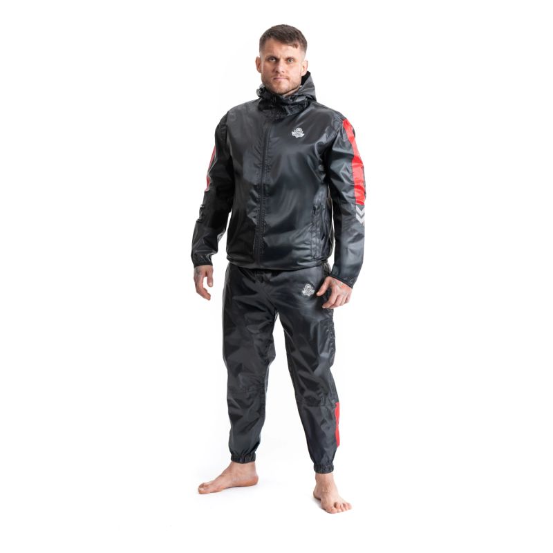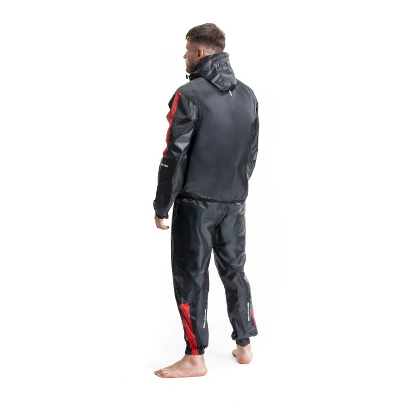 Ten profesjonalny komplet – bluza z kapturem i spodnie – został wykonany z wysokiej jakości materiału syntetycznego, który zatrzymuje ciepło i potęguje pocenie, pomagając w szybszym pozbywaniu się nadmiaru wody z organizmu.