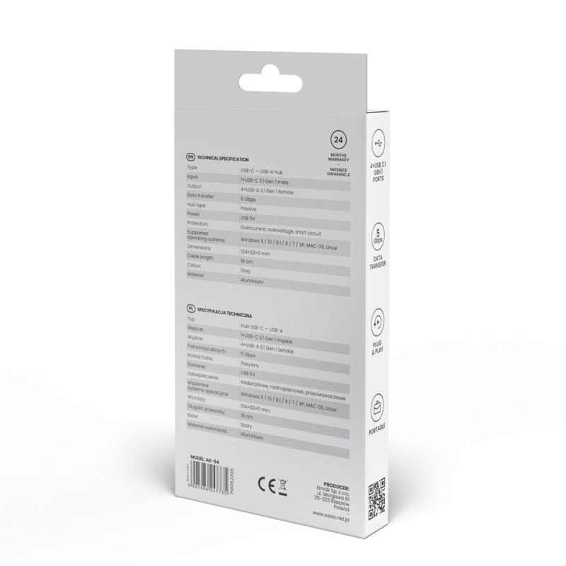 5. SAVIO AK-54 HUB USB-C - 4 X USB-A, SZARY