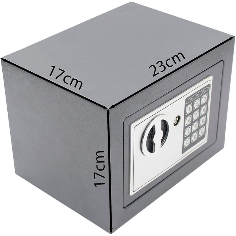 Dzięki niewielkim wymiarom 23x17x17 cm, sejf można łatwo umieścić w szafie, szufladzie, wnęce lub na półce, zapewniając dodatkowe bezpieczeństwo. Jego kompaktowy format umożliwia optymalne zagospodarowanie przestrzeni, jednocześnie oferując wystarczająco dużo miejsca na przechowywanie najważniejszych przedmiotów.
