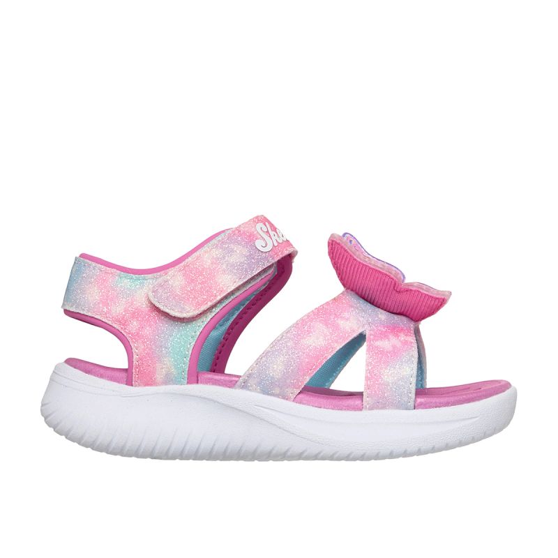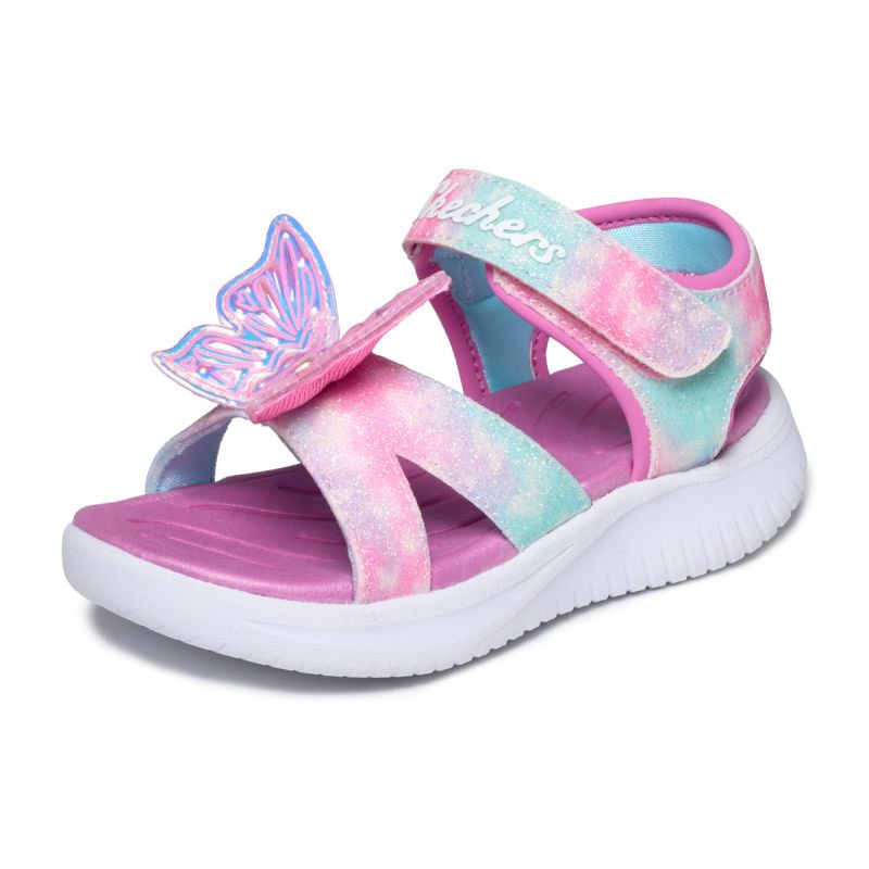 Rozjaśnij ich kroki powiewającym stylem w sandałach Skechers Jumpsters - Butterfly Brights. Ten świecący wzór motyla ma połyskującą cholewkę z syntetycznego paska, regulowane zapięcie Skechers i amortyzowaną, wygodną wkładkę.