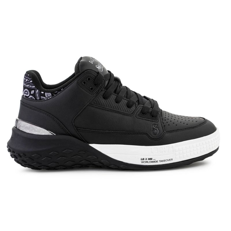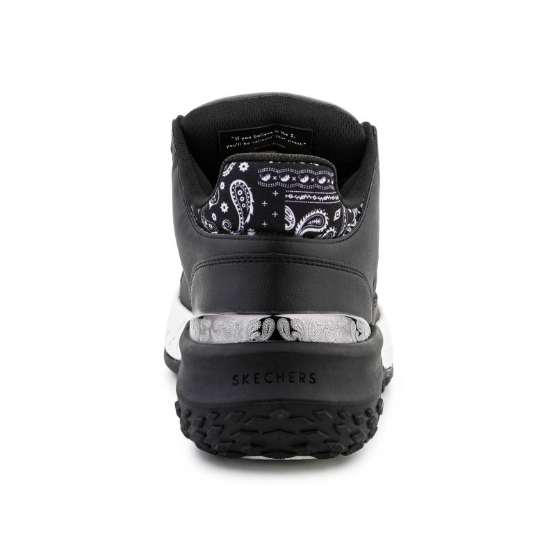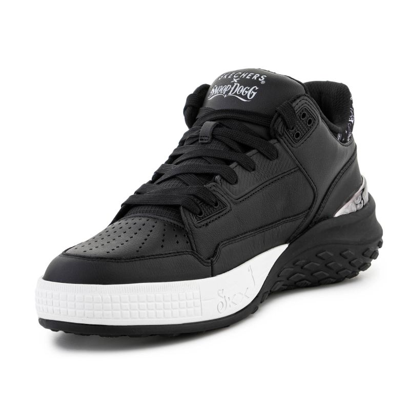 Model Skechers Sizzle Buckets OG 251180-BLK wyróżnia się skórzaną/cholewką premium z perforacjami oraz detalem kołnierza w stylu paisley. Górna część buta wykonana z mieszanki skóry, materiałów syntetycznych i tekstylnych, co zapewnia trwałość oraz komfort użytkowania.