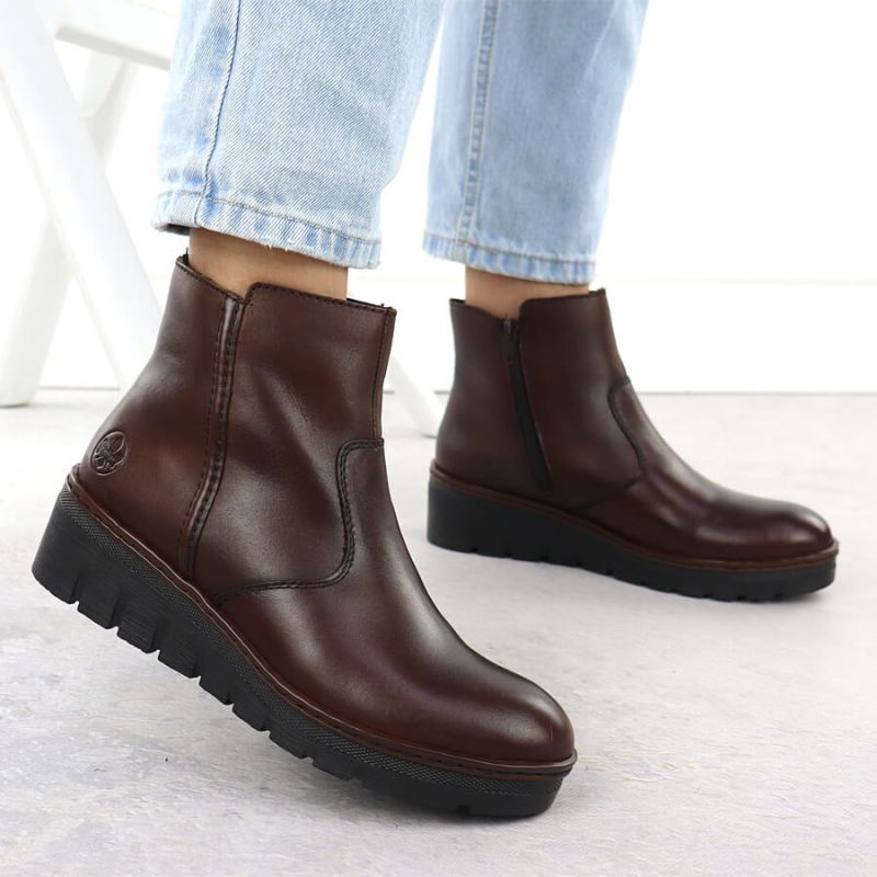 Skórzane botki damskie na koturnie brązowe Rieker X9165-27
