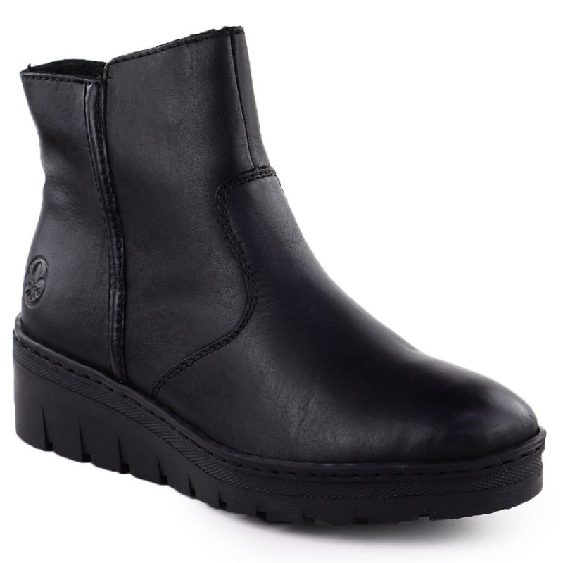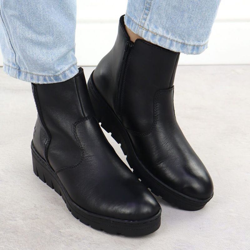 Skórzane botki damskie na koturnie czarne Rieker X9165-01