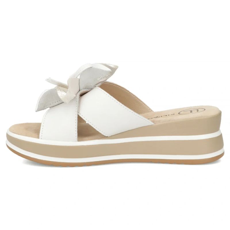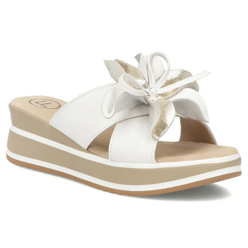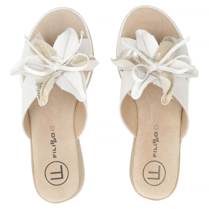 Skórzane klapki damskie na koturnie z kwiatem białe Filippo DK7636