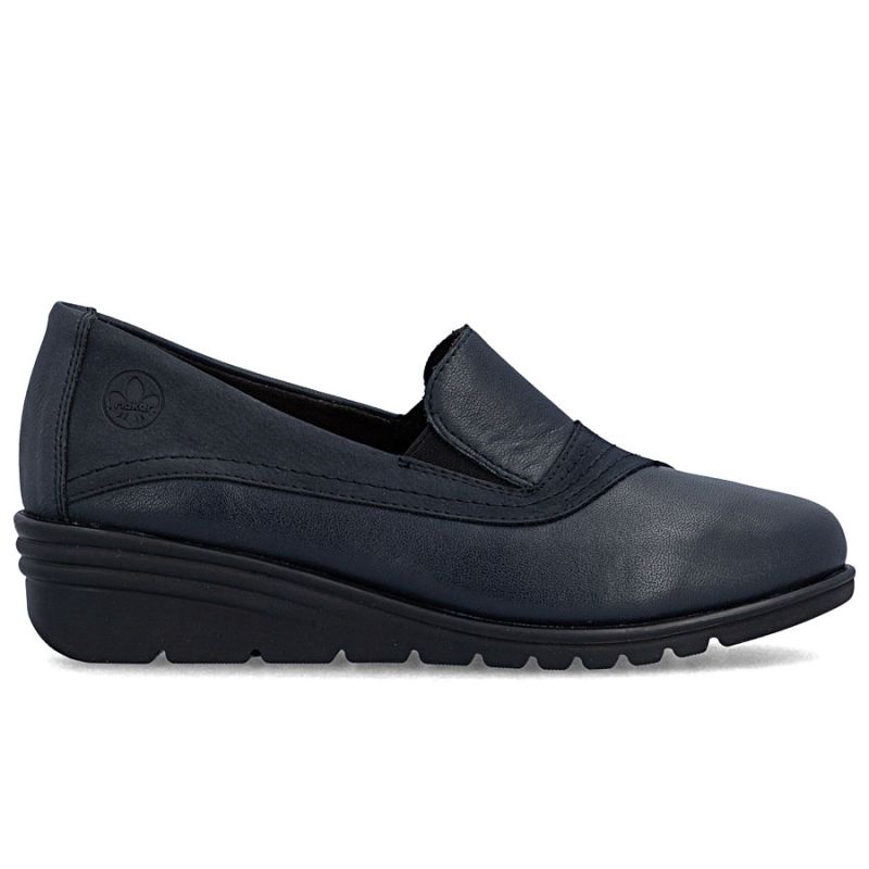 Skórzane półbuty damskie na koturnie granatowe Rieker L5356-14