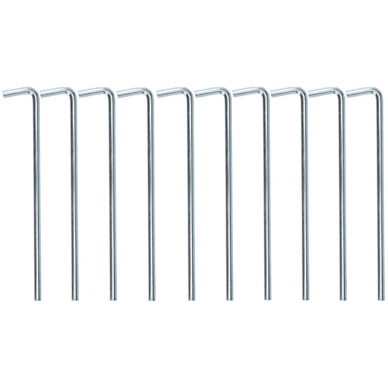 Zestaw składa się z 10 metalowych śledzi wyposażonych w specjalny zagięty uchwyt ułatwiający wbijanie w podłoże.