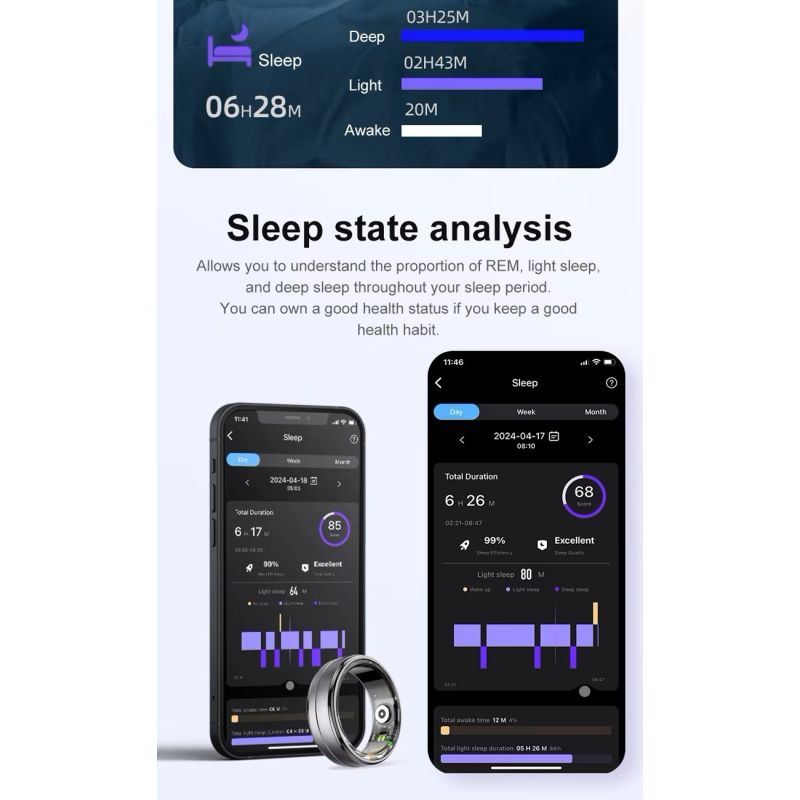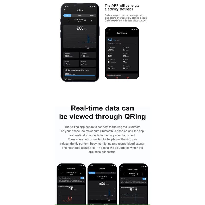 Dane w czasie rzeczywistym dostępne przez aplikację QRing. Nawet jeśli pierścień nie jest aktualnie połączony z telefonem, potrafi niezależnie monitorować organizm, rejestrować poziom tlenu we krwi oraz tętno. Dane zostaną zsynchronizowane z aplikacją przy następnym połączeniu.