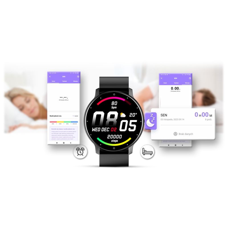 Funkcja ta pozwala monitorować czas i jakoś snu każdej nocy. Po zsynchronizowaniu danych z aplikacją możesz sprawdzać i analizować jakość swojego snu. Historia pokaże jak śpisz i czy twój sen jest dobrej jakości. Po ciężkim dniu każdy musi się wyspać, żeby nabrać sił na kolejny dzień i w tym pomoże Ci ten smartwatch.