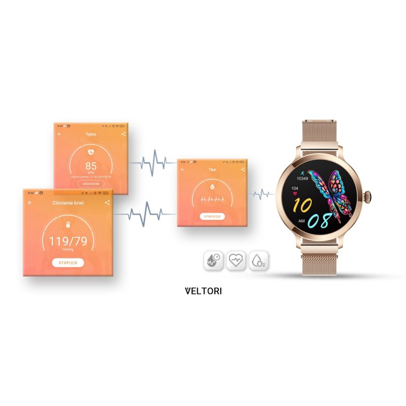 Dzięki sensorowi możesz w każdej chwili zmierzyć lub wykonać pomiar: ciśnienie krwi, tętno lub saturację - zawartość tlenu we krwi w swoim organizmie. Kontroluj wyniki podczas każdej aktywności fizycznej. Niezależnie czy jeździsz na rowerze, biegasz, czy też po prostu jesteś w pracy lub odpoczywasz. Twój smartwatch Veltori stanie się osobistym asystentem dbającym o twoje zdrowie każdego dnia.