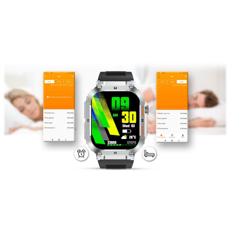 Funkcja ta pozwala monitorować czas i jakoś snu każdej nocy. Po zsynchronizowaniu danych z aplikacją możesz sprawdzać i analizować jakość swojego snu. Historia pokaże jak śpisz i czy twój sen jest dobrej jakości. Po ciężkim dniu każdy musi się wyspać, żeby nabrać sił na kolejny dzień i w tym pomoże Ci ten smartwatch.