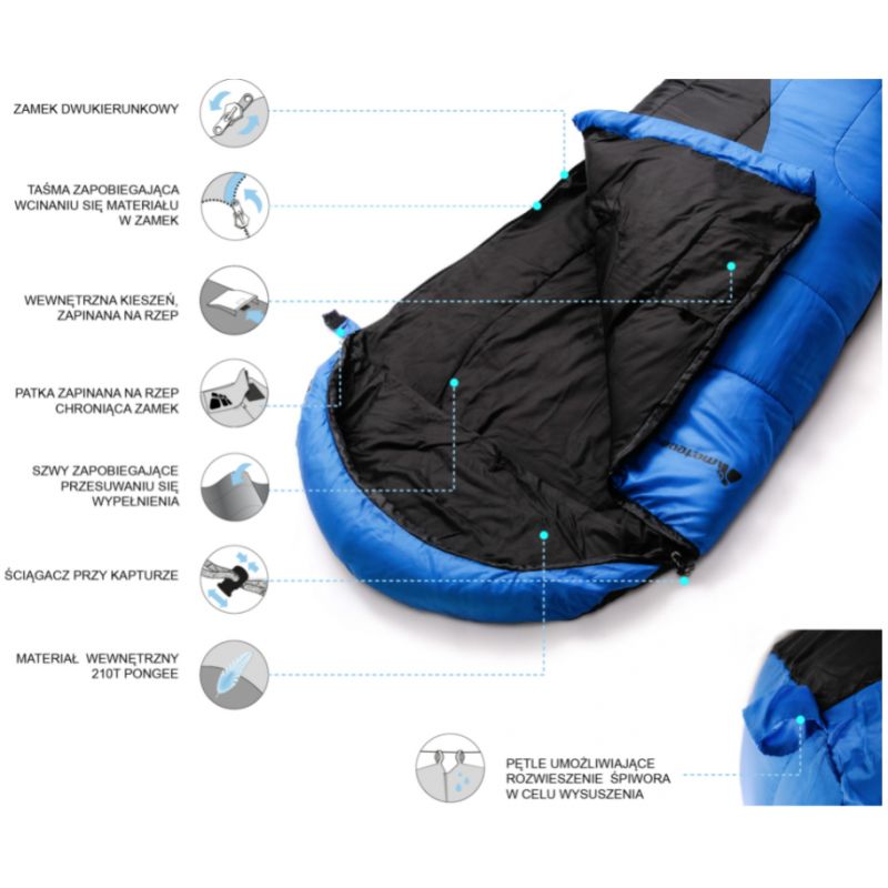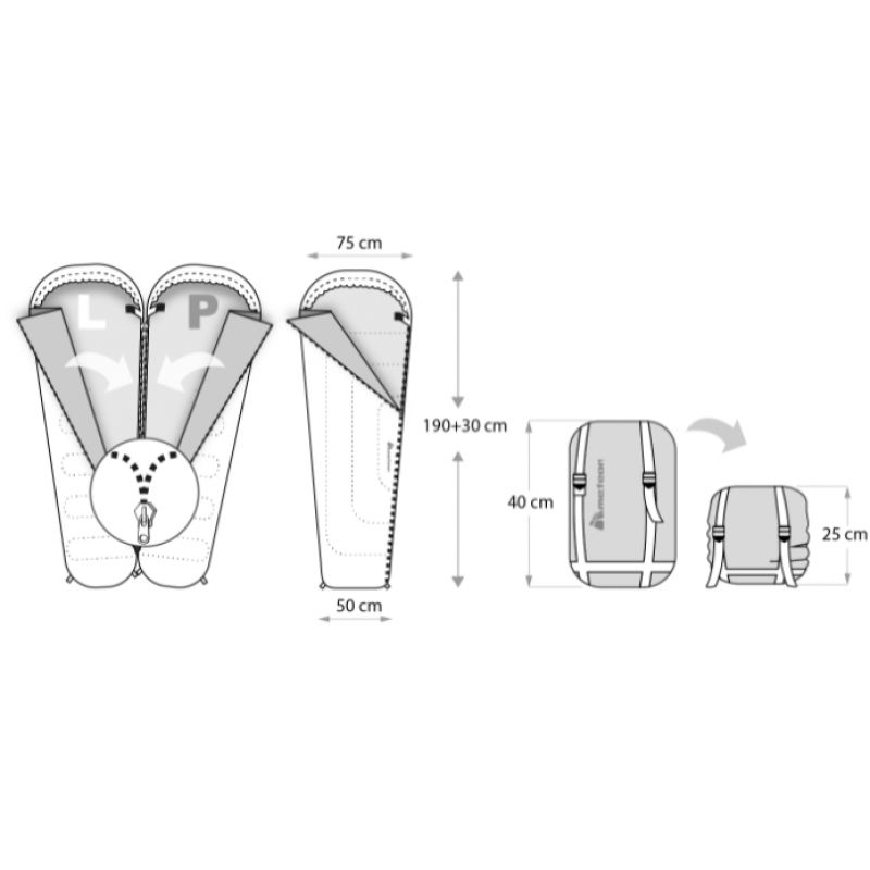 - Model ten występuje w dwóch wersjach: z zamkiem po prawej i po lewej stronie. Dzięki temu istnieje możliwość połączenia śpiworów ze sobą.