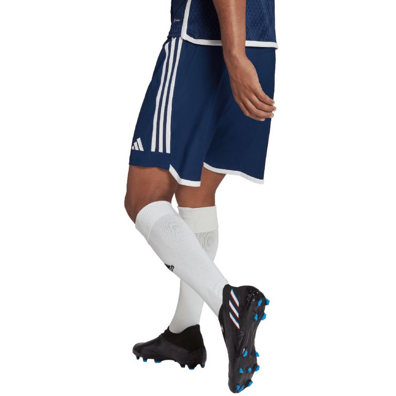 Spodenki męskie adidas Tiro 23 Competition Match granatowe HT5697 Męskie spodenki adidas sprawdzą się podczas rozgrywek meczowych. Model pochodzi z linii Tiro 23. Elastyczna talia regulowana wewnętrznym sznurkiem. Technologia Aeroready pomaga odprowadzać nadmiar wilgoci do zewnętrznych warstw. Materiał: 100% poliester pochodzący z recyklingu