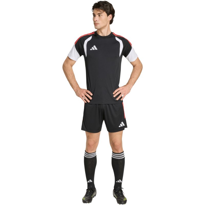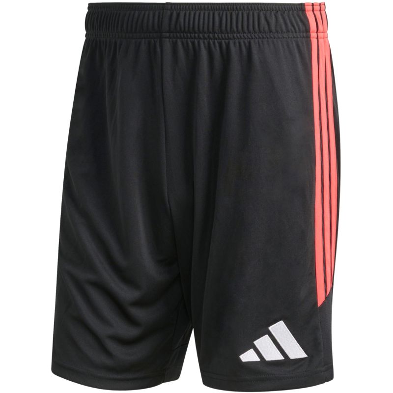 Spodenki męskie adidas Tiro 26 League czarno-czerwone KA8776 Męskie spodenki adidas sprawdzą się podczas rozgrywek. Model pochodzi z linii Tiro. Standardowy krój. Elastyczna talia regulowana wewnętrznym sznurkiem. Technologia Climacool. Paski po bokach. Niewielkie, wyszywane logo. Materiał: 100% poliester pochodzący z recyklingu