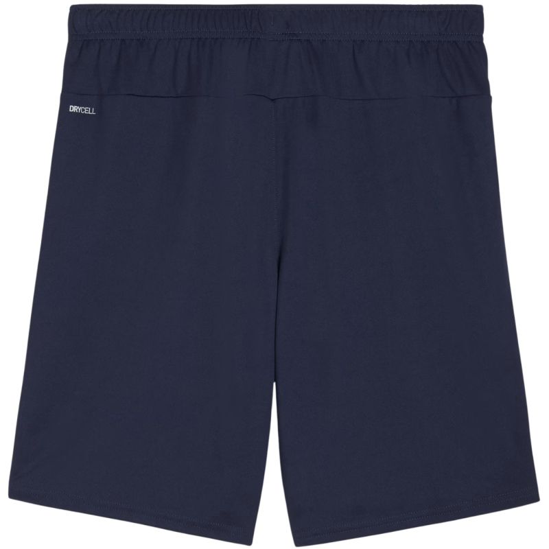 Spodenki męskie Puma Team Goal granatowe 705752 06 Męskie spodenki Puma sprawdzą się podczas treningów. Regularny krój. Model z kolekcji teamGOAL. Szybkoschnąca tkania z technologią DryCell odprowadza nadmiar wilgoci. Elastyczna talia. Siateczkowe wstawki po bokach. Niewielkie logo Puma. Materiał: 100% poliester