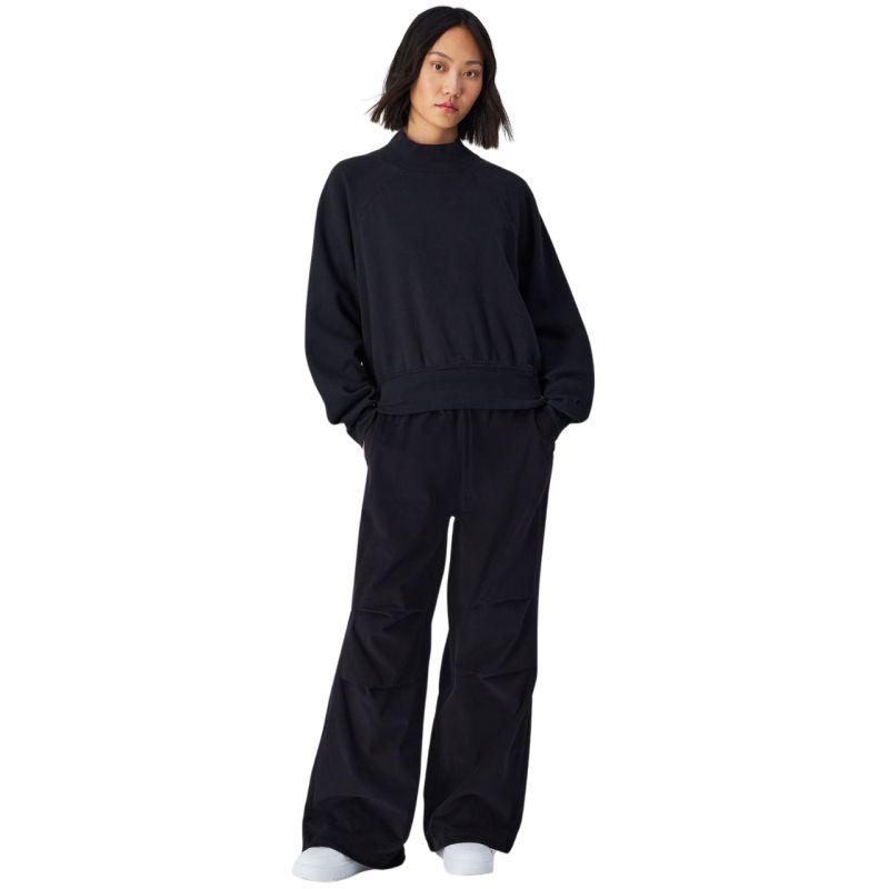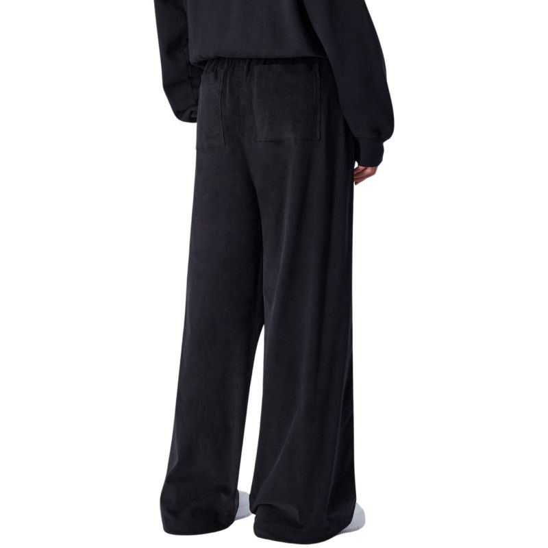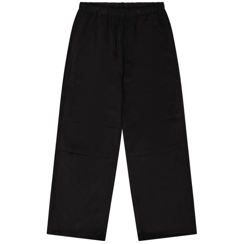 - Luźny krój z szerokimi nogawkami wykończonymi ściągaczem ze stoperem.