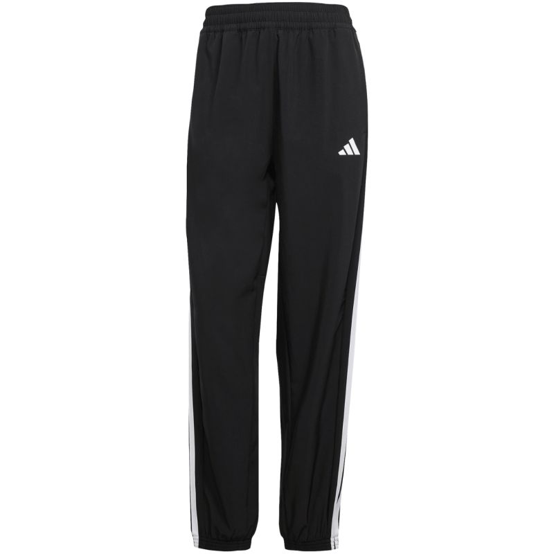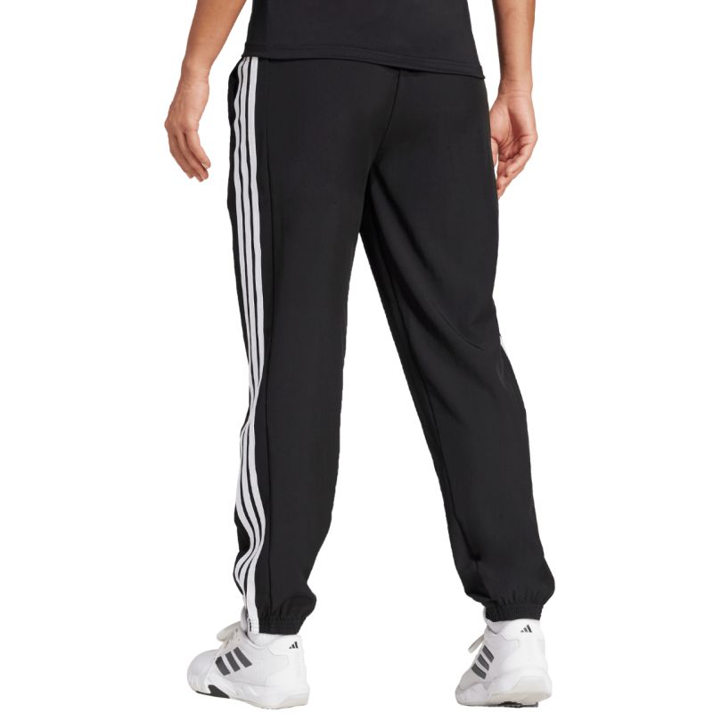 Spodnie damskie adidas Train Essentials 3-Stripes Woven czarne JI8313 Spodnie damskie adidas sprawdzą się w trakcie aktywności. Regulowany krój ze średnim stanem zyskał elastyczną talię. Szersze, lekko zwężane ku dołowi nogawki wykończone elastycznymi ściągaczami. Otwarte kieszenie boczne. Technologia Climacool pomaga odprowadzać pot z powierzchni skóry. Materiał: 87% poliester z recyklingu, 13% elastan