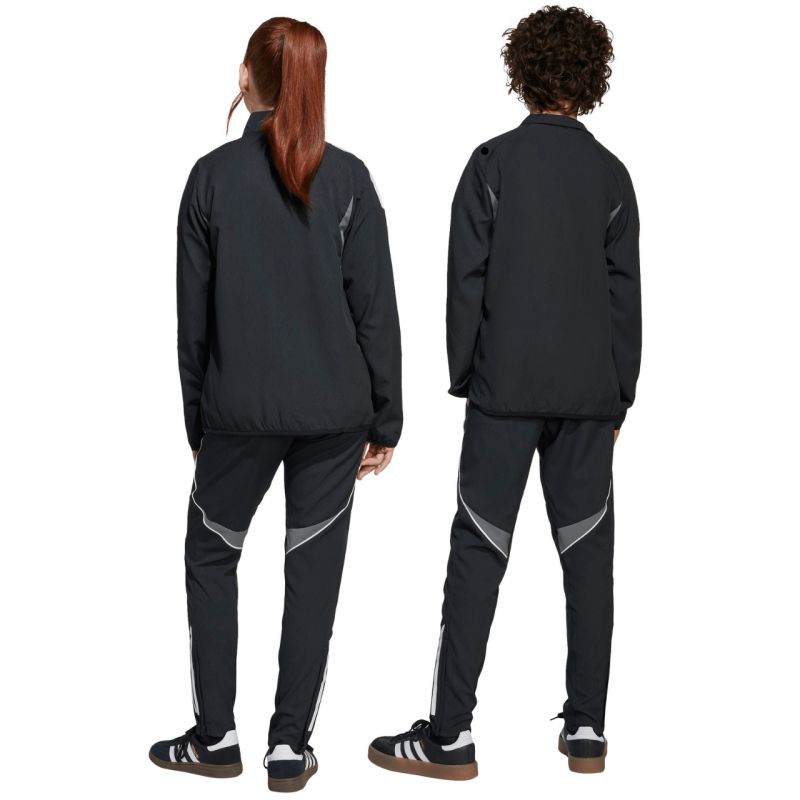 Spodnie dla dzieci adidas Tiro 25 Competition Presentation czarne IW0447 Spodnie dla dzieci adidas sprawdzą się podczas treningów i odpoczynku poza linią boczną boiska piłkarskiego. Regularny krój. Elastyczna talia dodatkowo regulowana wewnętrznym sznurkiem. Zapinane kieszenie boczne. Nogawki wykończone suwakami. Pozyskane w procesie recyklingu włókna. Model pochodzi z linii Tiro. Technologia Aeroready odprowadza wilgoć. Spodnie zapewnią wygodę i sportowy wygląd, gdy trenujesz i dbasz o odpowiednią regenerację po treningu. Materiał: 100% poliester z recyklingu