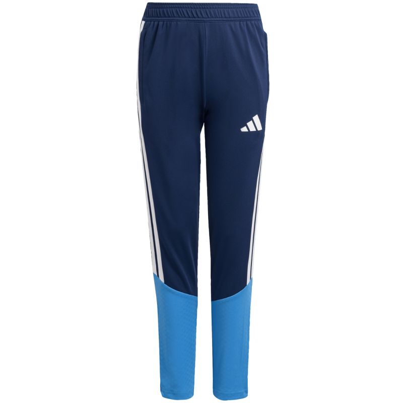 Spodnie dla dzieci adidas Tiro 26 Competition Training granatowo-błękitne JN2260 Spodnie dla dzieci adidas sprawdzą się podczas treningu. Fason z linii Tiro wyprodukowano z szybkoschnących włókien powstałych w procesie recyklingu. Dopasowany krój z elastyczną talią regulowaną sznurkiem. Zapinane kieszenie boczne. Zamki u dołu nogawek. Technologia Formotion pozwala na ruch bez ograniczeń. Materiał: 100% poliester z recyklingu