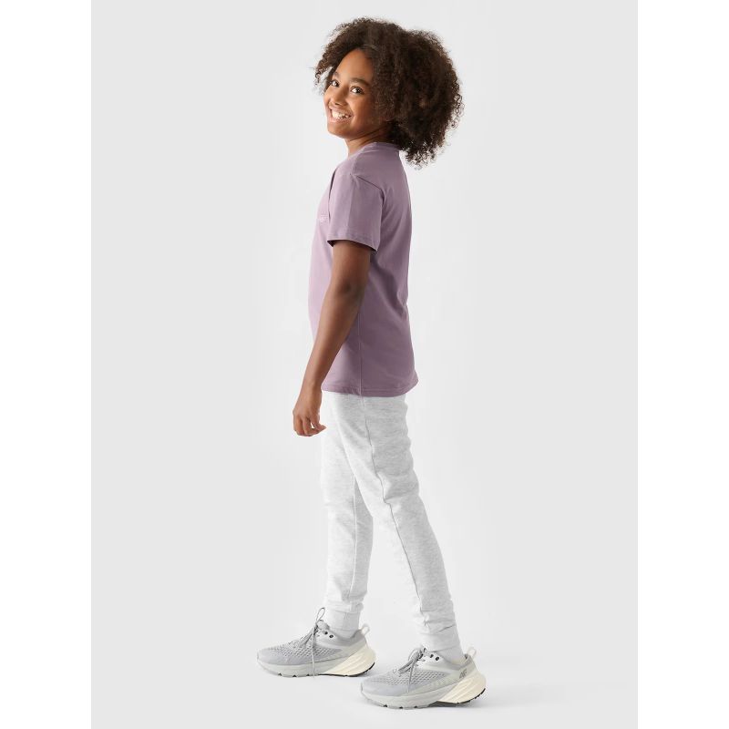 Dresy 4F dla dziewczyny wykonane z dzianiny o średniej gramaturze 260 gsm, która sprawia, że są one miękkie oraz bardziej przewiewne. Dziecięce spodnie dresowe są wykonane w 78% z bawełny, dzięki czemu są miękkie, trwałe i przyjemne w dotyku. Dodatek poliestru (22%) sprawia, że materiał utrzymuje fason i jest odporny na zużycie nawet przez wiele sezonów. Czesane wnętrze gwarantuje dodatkowe ciepło, co sprawia, że spodnie będą idealnym wyborem na chłodniejsze dni. Po bokach znajdują się 2 kieszenie otwarte. Elastyczny pas bez regulacji.
