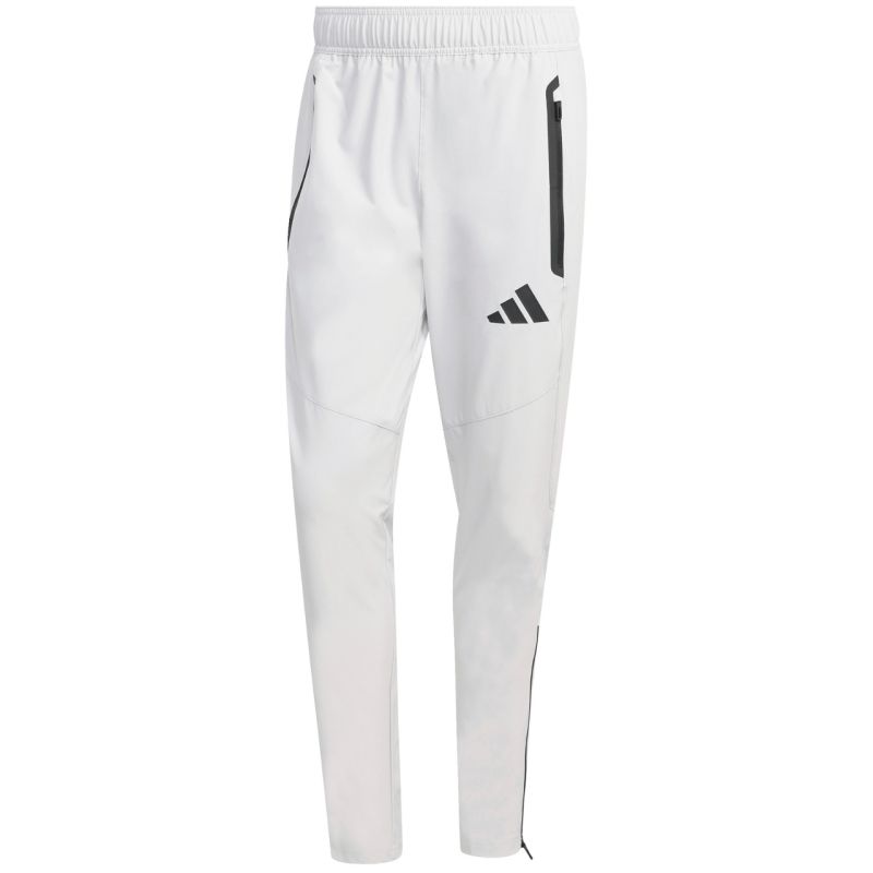 Spodnie męskie adidas Tiro 26 Travel Woven jasnoszare KE8363 Spodnie męskie adidas będące częścią linii Tiro sprawdzą się podczas odpoczynku pomiędzy sesjami treningowymi. Szybkoschnący materiał o płóciennym splocie. Regularny krój. Zwężane ku dołowi nogawki z ergonomicznymi przeszyciami wykończono suwakami. Elastyczna talia. Zapinane kieszenie boczne. Niewielkie logo. Materiał: 87% poliester z recyklingu, 13% elastan