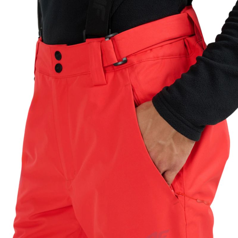 Spodnie narciarskie męskie 4F FNK M1155 czerwone 4FWAW25TFTRM1155 62S Spodnie narciarskie męskie 4F sprawdzą się w zmiennych warunkach pogodowych zapewniając pełną swobodę ruchów. Dane techniczne:· Materiał główny: 100% poliester· Materiał dodatkowy: 100% poliester· Podszewka: 100% poliester· Wypełnienie: 100% poliester (ocieplina poliestrowa)· Poziom wodoodporności membrany: 5 000 mm· Poziom oddychalności membrany: 3 000 g· Membrana 4F NeoDry 5000/3000 - zapewnia wodoodporność i oddychalność, chroniąc przed lekkim deszczem i śniegiem· Hydrofobowa impregnacja - zabezpiecza materiał przed wchłanianiem wilgoci· Klejone szwy całkowite - chronią przed przedostawaniem się wilgoci do wnętrza· Ocieplina poliestrowa - zapewnia optymalny komfort cieplny bez nadmiernego obciążenia· Zapinany, regulowany pas - łączy zapięcie na zamek, rzep i napy oraz regulację na rzepy dla wygodnego dopasowania· Odpinane, regulowane szelki - pozwalają na indywidualne dopasowanie i możliwość szybkiego zdjęcia· Wentylacja na udach – system z zamkami po wewnętrznej stronie ud wspiera termoregulację podczas intensywnego ruchu· Wzmocnienia u dołu nogawek - zwiększają trwałość w miejscach narażonych na uszkodzenia· 2 kieszenie boczne na zamek - zabezpieczają drobiazgi podczas aktywności· Profilowane kolana - poprawiają swobodę ruchu na stoku· Wewnętrzne nogawki przeciwśnieżne - skutecznie chronią przed śniegiem wpadającym do środka· Boczne zamki u dołu nogawek - ułatwiają zakładanie na buty narciarskie· Elementy odblaskowe - zwiększają widoczność· Gładka podszewka - zapewnia komfort noszenia i łatwe zakładanie· Regularny krój - wygodnie dopasowuje się do sylwetki, nie krępuje ruchów· Nogawki pełnej długości - sięgają za kostkę i chronią nogi na całej długości· Średni stan - dla komfortowego dopasowania do pasa