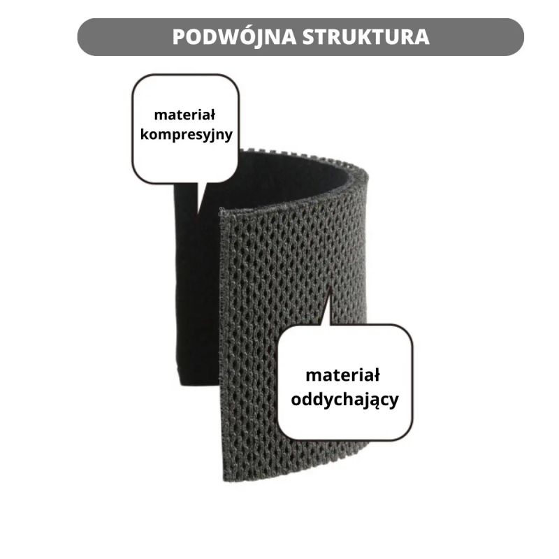Dwuwarstwowa powłoka zapewnia dodatkową kompresję więzadła rzepki, poprawiając jego stabilizację i minimalizując ryzyko przeciążeń.