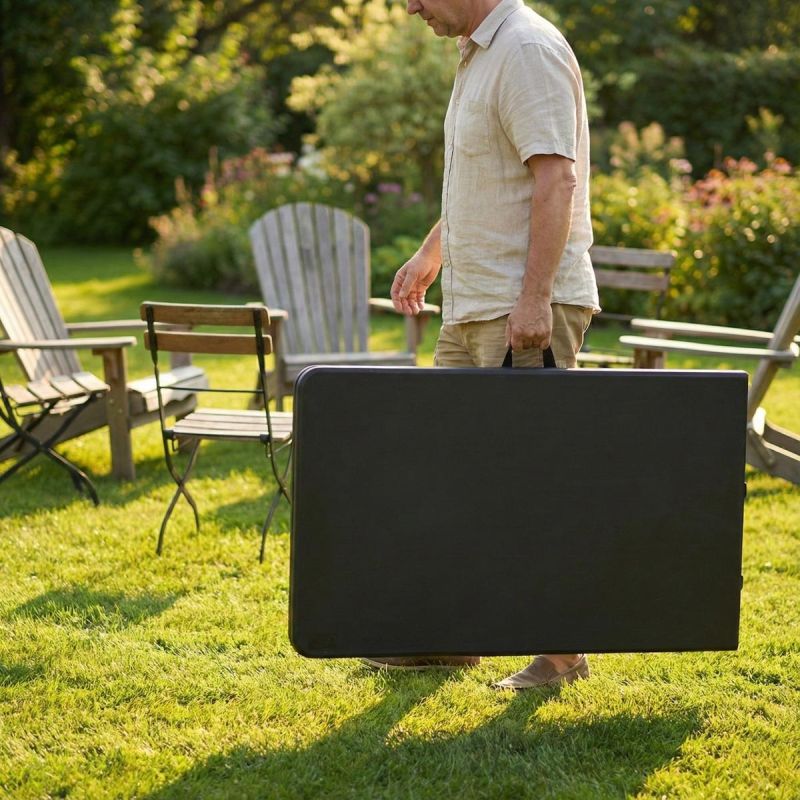 Po złożeniu stół przybiera formę poręcznej walizki z uchwytem. To idealne rozwiązanie do szybkiego transportu i przechowywania w małych przestrzeniach, takich jak bagażnik auta czy schowek.