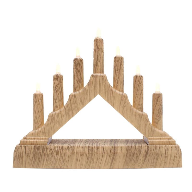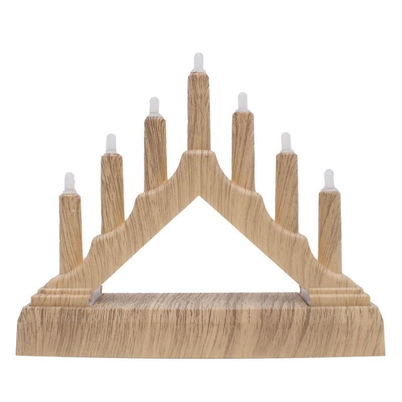 Nowoczesne lampki adwentowe mogą mieć różne kształty, mogą być w stylu glamur lub ECO, mogą być z brokatem lub z lampkami LED. Ta lampka ma tradycyjny kształt i imituje 7 świec osadzonych na drewnianej ramie.
