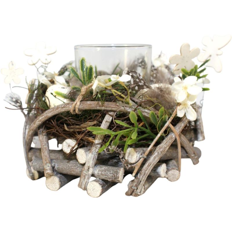 Wykonany z dużą starannością w wiosennej kolorystyce, będzie się pięknie prezentować na Twoim wielkanocnym stole, na komodzie lub na biurku. Dzięki specjalnemu szklanemu naczyniu, można w nim umieścić świeczkę typu tea light o średnicy ok. 5 cm.
