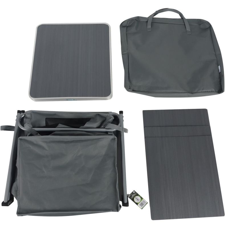 - Materiały: Oxford 600 D, płyta MDF blat o grubości 4,5mm i półki o grubości 3mm, stal
