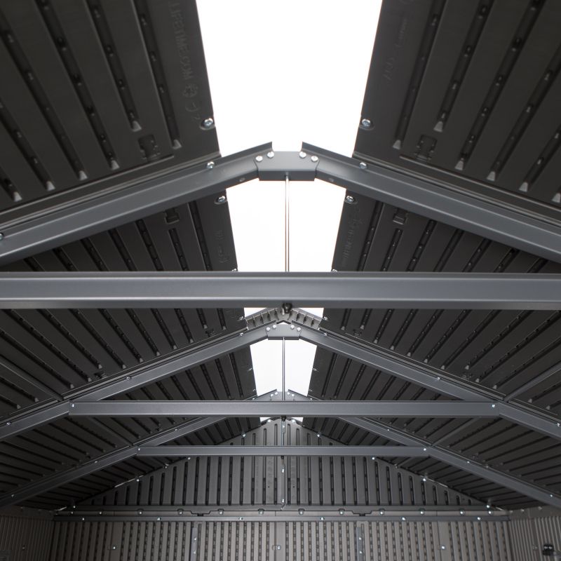 Świetlik wykonany z wytrzymałego materiału, biegnący przez całą długość dachu, zapewnia maksimum naturalnego oświetlenia. Podwójne drzwi z zawiasami zamykane na zamek otwierają się do prawie do 180 stopni, dzięki czemu możemy wnieść do środka nawet duże sprzęty. Antypoślizgowa podłoga polietylenowa i łatwa w konserwacji konstrukcja wzmocniona stalą zapewniają komfort użytkowania na długie lata.