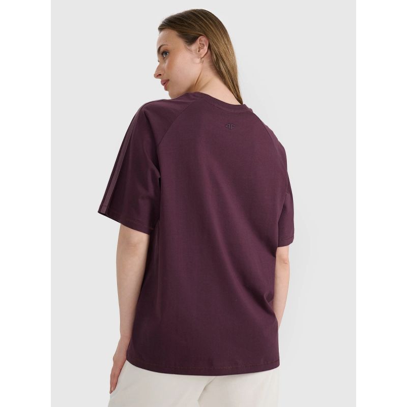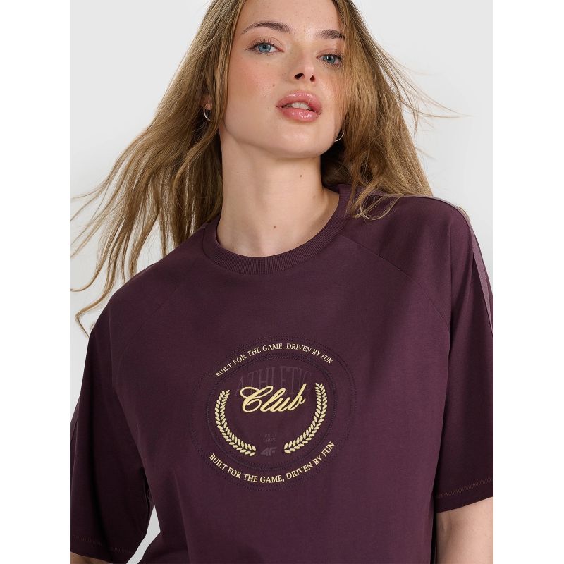 Ten damski T-shirt łączy luźny, swobodny krój oversize z miękką, naturalną bawełną, zapewniając pełen komfort w cieplejsze dni. Gładka dzianina single jersey oraz raglanowe rękawy podkreślają casualowy charakter, a nadruk z przodu nadaje koszulce wyrazistego, sportowego stylu. To model, który sprawdzi się zarówno w codziennych, jak i bardziej aktywnych stylizacjach.