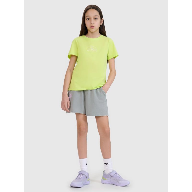 T-shirt dziewczęcy 4Fjest wykonany w 100% z bawełny, co gwarantuje wysoki komfort, trwałość i przyjemność noszenia. Okrągły dekolt wykończony jest lekkim ribem, a nadruk z motywem surferskim dodaje energii i letniego stylu.