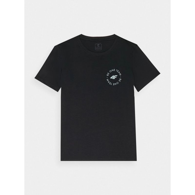 100% bawełny w składzie zapewnia przyjemne uczucie na skórze, trwałość i łatwość użytkowania. Okrągły dekolt z lekkim ribowaniem zwiększa wygodę noszenia, a nadruk z przodu „4F Be One Team” podkreśla sportowy charakter koszulki.