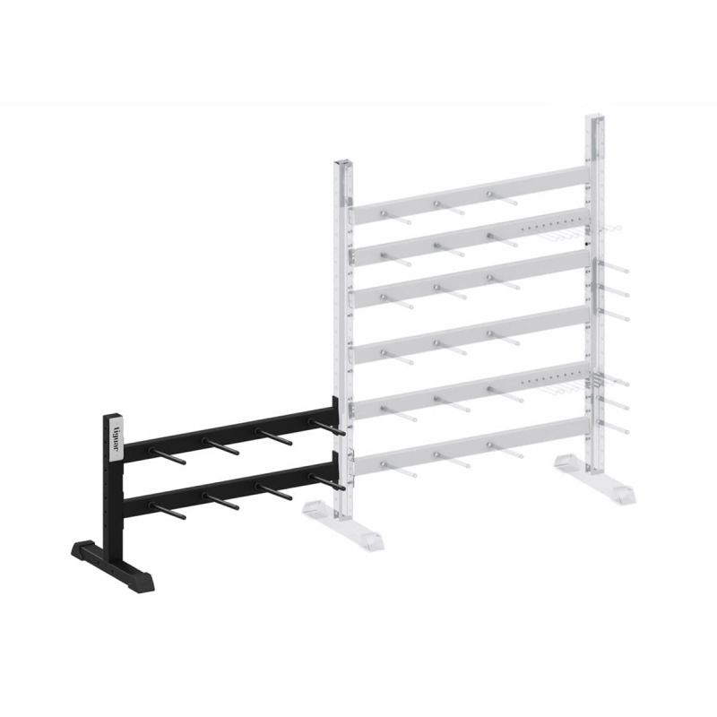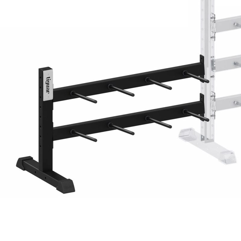 Dodatkowy moduł do stojaka na sztangi 22/24. Dzięki temu dedykowanemu rozwiązaniu, można przechowywać dodatkowe komplety talerzy. Ten moduł to idealne rozwiązanie na obciążenia o wadzie 7.5 kg do zestawów sztangi butterfly. Moduł składa się z dwóch belek oraz jednej nogi. Belka wyposażona jest w 4 uchwyty na talerze sztang fitness tiguar powergym oraz tiguar butterfly. Każdy z uchwytów jest w stanie pomieścić 8 szt talerzy 1.25 kg lub 2.5 kg lub 5 kg lub 4 szt 7.5 kg. Aby zamontować moduł potrzebujesz podstawowej wersji stojaka. Mocne strony stojaka modułowego na sztangi Profesjonalny, modułowy stojak służący do pionowego przechowywania sztang typu powergym oraz butterfly w siłowniach i klubach fitness. Ergonomiczna konstrukcja rozwiązania łączy w sobie funkcję stojaka na gryfy oraz wieszaka na obciążenie, skutecznie zastępując dwa pojedyncze akcesoria. Modułowy stojak na powergym to solidna stalowa konstrukcja nośna wykonana z metalowych profili grubości 3 mm. Trwałość połączenia poszczególnych elementów zapewniają śruby klasy 10.9, które poddane zostały procesowi galwanizacji. Dodatkowe pokrycie czarnym cynkiem zwiększa ich odporność na korozję, znacząco wydłużając żywotność sprzętu i zachowanie wysokiej estetyki z biegiem czasu. Solidna podstawa modułowego stojaka na powergym z dodatkowym karbowaniem na spodzie zapewnia wysoką przyczepność i stabilność na różnego rodzaju podłożu, gwarantując pełne bezpieczeństwo nawet przy maksymalnym obciążeniu stojaka. Produkt pomalowany został proszkowo, co podkreśla wysokie walory estetyczne rozwiązania. Ważne informacje długość: 127 cm głębokość: 65 cm wysokość: 80 cm waga: 29 kg kolor: czarny materiał: stal Okres gwarancji: 60 miesięcy W trakcie użytkowania Przechowywać z dala od promieni UV, rozpuszczalników organicznych i nieorganicznych. Produkt przeznaczony do użytku wewnątrz pomieszczeń.