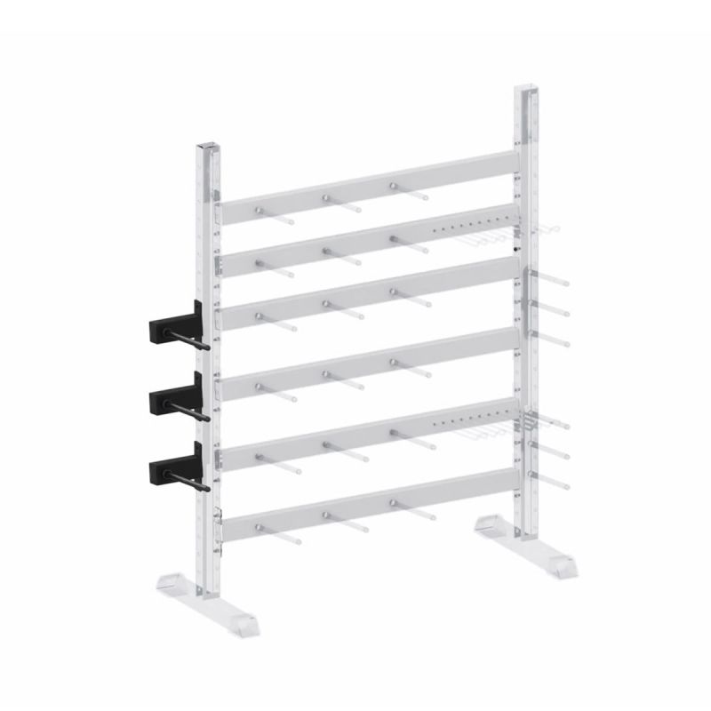 Dodatkowy uchwyt na talerze do modułowego stojaka na sztangi 22/24. Dzięki temu dedykowanemu rozwiązaniu, można przechowywać na stojaku modułowym na sztangi dodatkowe 8 szt talerzy 1.25 kg lub 2.5 kg lub 5 kg lub 4 szt 7.5 kg. Aby zamontować uchwyt potrzebujesz podstawowej wersji stojaka. Mocne strony stojaka modułowego na sztangi Profesjonalny, modułowy stojak służący do pionowego przechowywania sztang typu powergym oraz butterfly w siłowniach i klubach fitness. Ergonomiczna konstrukcja rozwiązania łączy w sobie funkcję stojaka na gryfy oraz wieszaka na obciążenie, skutecznie zastępując dwa pojedyncze akcesoria. Modułowy stojak na powergym to solidna stalowa konstrukcja nośna wykonana z metalowych profili grubości 3 mm. Trwałość połączenia poszczególnych elementów zapewniają śruby klasy 10.9, które poddane zostały procesowi galwanizacji. Dodatkowe pokrycie czarnym cynkiem zwiększa ich odporność na korozję, znacząco wydłużając żywotność sprzętu i zachowanie wysokiej estetyki z biegiem czasu. Solidna podstawa modułowego stojaka na powergym z dodatkowym karbowaniem na spodzie zapewnia wysoką przyczepność i stabilność na różnego rodzaju podłożu, gwarantując pełne bezpieczeństwo nawet przy maksymalnym obciążeniu stojaka. Produkt pomalowany został proszkowo, co podkreśla wysokie walory estetyczne rozwiązania. Ważne informacje długość: 20 cm głębokość: 40 cm wysokość: 19 cm waga: 2 kg kolor: czarny materiał: stal Okres gwarancji: 60 miesięcy W trakcie użytkowania Przechowywać z dala od promieni UV, rozpuszczalników organicznych i nieorganicznych. Produkt przeznaczony do użytku wewnątrz pomieszczeń.