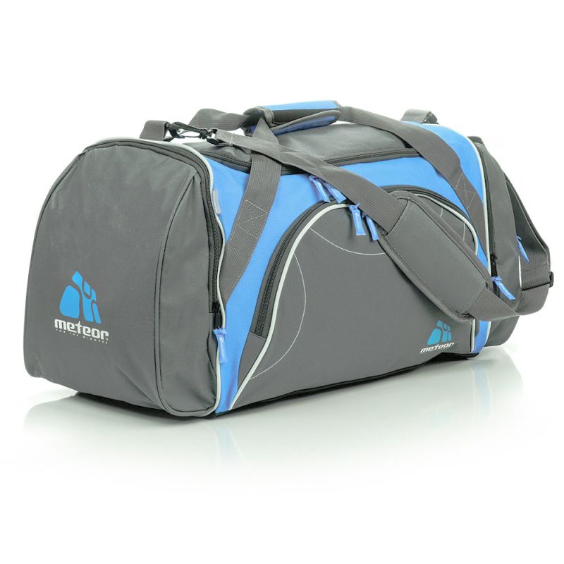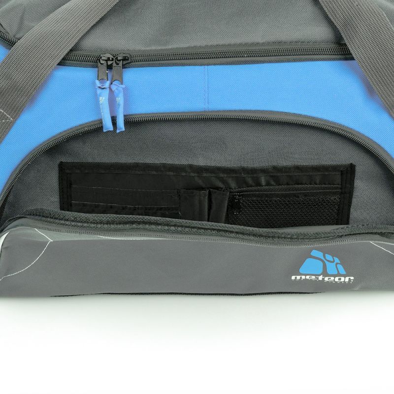 Uniwersalna torba sportowa marki Meteor. Sprawdzi się jako torba treningowa lub podróżna. Model posiada liczne kieszenie (4 na zewnątrz plus główna komora) oraz dodatkowe mniejsze wewnątrz. Została wykonana z wysokogatunkowych tkanin, które gwarantują wytrzymałość i długie użytkowanie torby. Gumowany spód ze stopkami chroni torbę przed przetarciami, zabrudzeniami oraz wilgocią. Wewnątrz głównej komory znajduje się miejsce na karteczkę z danymi właściciela. Torbę można nosić przy pomocy długiego, regulowanego pasa albo dwóch mniejszych uchwytów. Na froncie umieszczono logo Meteor.