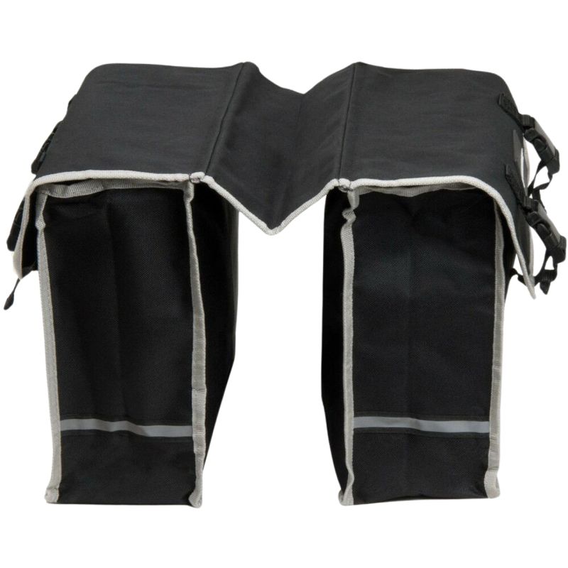 Podwójne torby na bagażnik mocowane są za pomocą mocnych pasków z rzepami. Dwie, boczne klamry drabinkowe. Odblaskowe elementy.