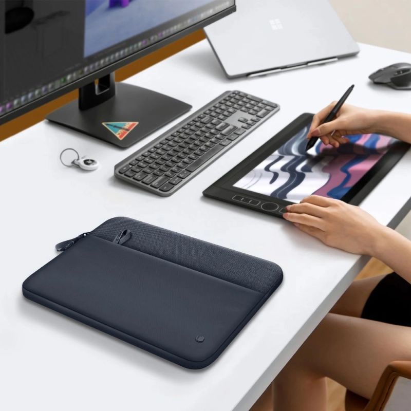 Pojemna kieszeń frontowa zwiększa funkcjonalność pokrowca, pozwalając na przechowywanie niezbędnych akcesoriów – zasilacza, kabli, myszy bezprzewodowej czy notatnika. Wszystkie potrzebne elementy pozostają uporządkowane w jednym miejscu, co ułatwia szybkie przygotowanie się do pracy i eliminuje konieczność szukania akcesoriów w różnych kieszeniach.