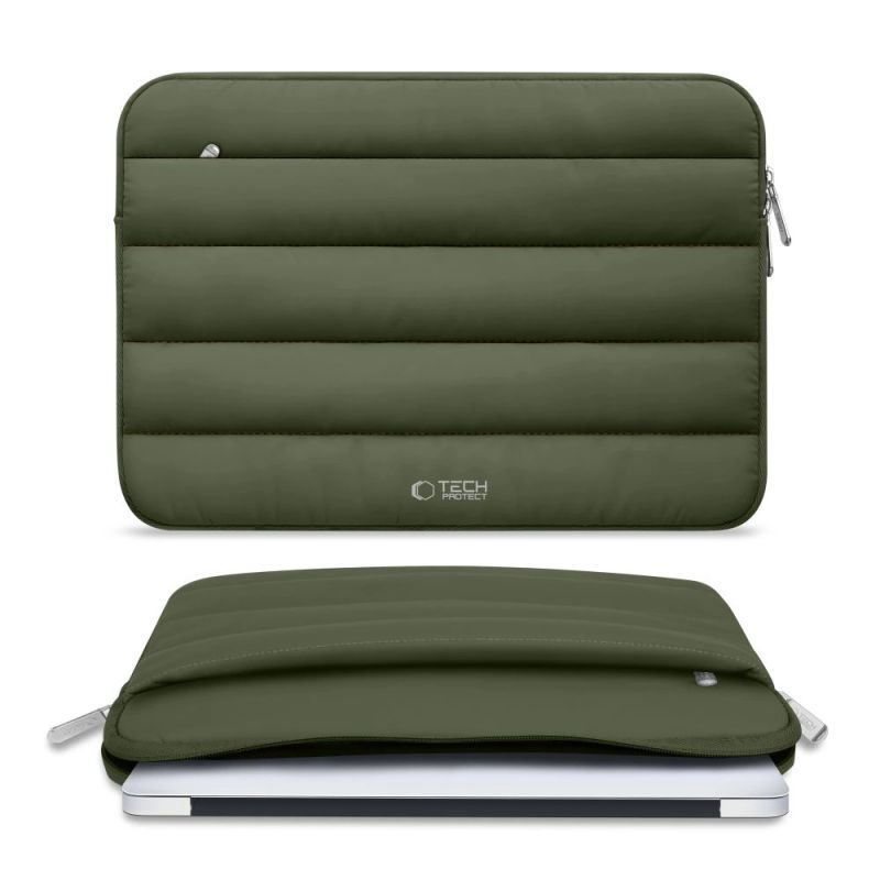 Etui posiada dwie praktyczne kieszenie – główną komorę na laptopa oraz dodatkową, mniejszą kieszeń z przodu, idealną na akcesoria, dokumenty czy drobne przedmioty. Całość uzupełnia eleganckie metalowe zapięcie oraz dyskretne logo Tech-Protect, które podkreślają nowoczesny i minimalistyczny design.