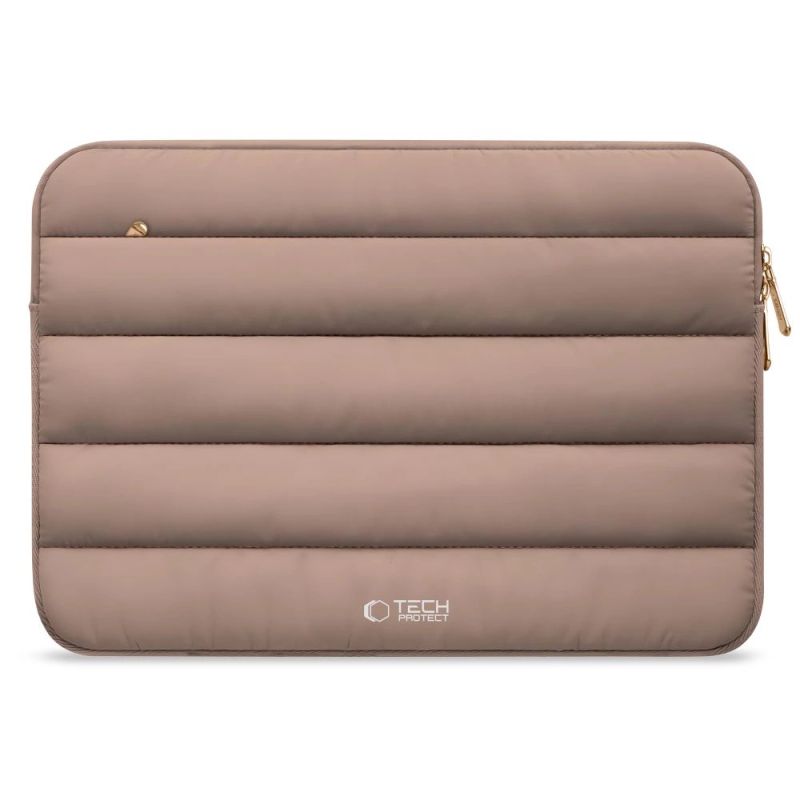 Etui posiada dwie praktyczne kieszenie – główną komorę na laptopa oraz dodatkową, mniejszą kieszeń z przodu, idealną na akcesoria, dokumenty czy drobne przedmioty. Całość uzupełnia eleganckie metalowe zapięcie oraz dyskretne logo Tech-Protect, które podkreślają nowoczesny i minimalistyczny design.