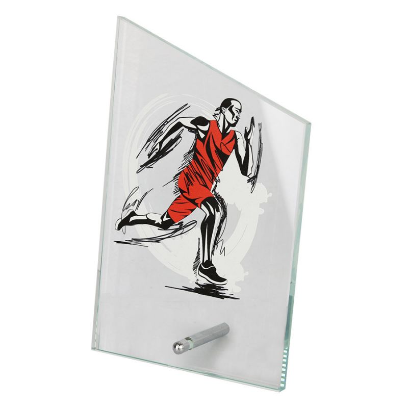 Przezroczyste trofeum ścięte pod skosem wykonane ze szkła z metalową podpórką. Istnieje możliwość wykonania grawertonu na tabliczce - usługa dodatkowa (cena uzależniona od powierzchni nadruku).