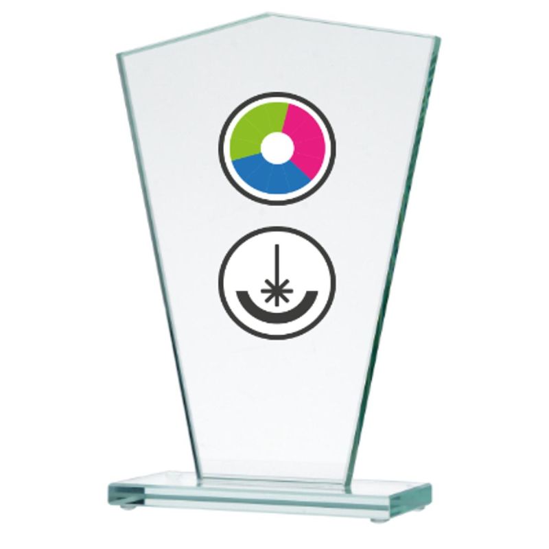 Trofeum szklane z nadrukiem kolorowym LuxorJet, grawerowaniem oraz wypełnieniem farbą